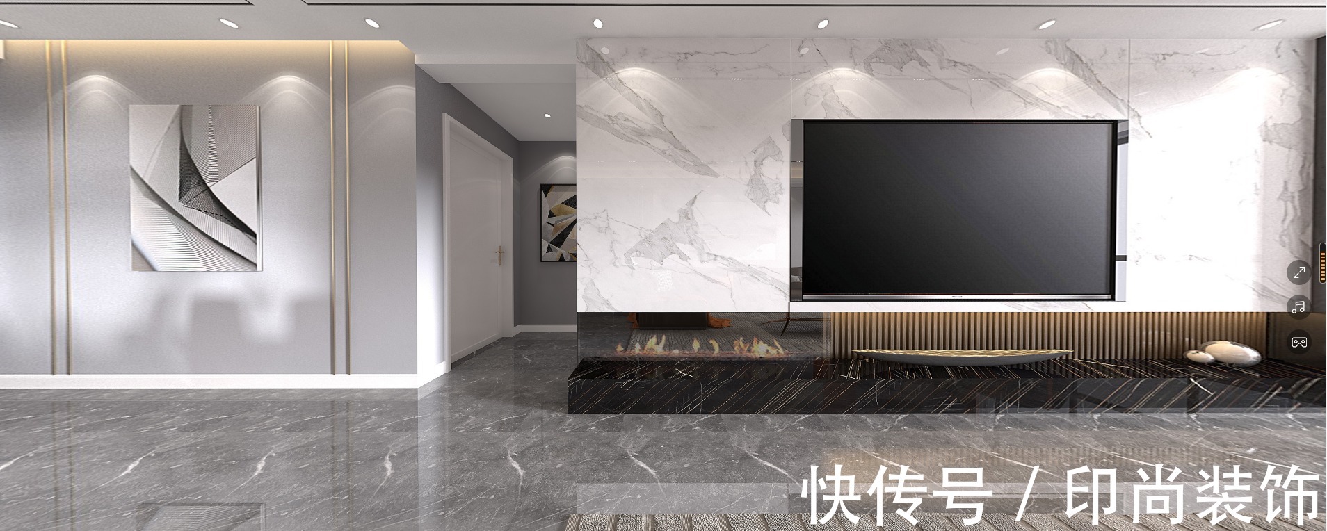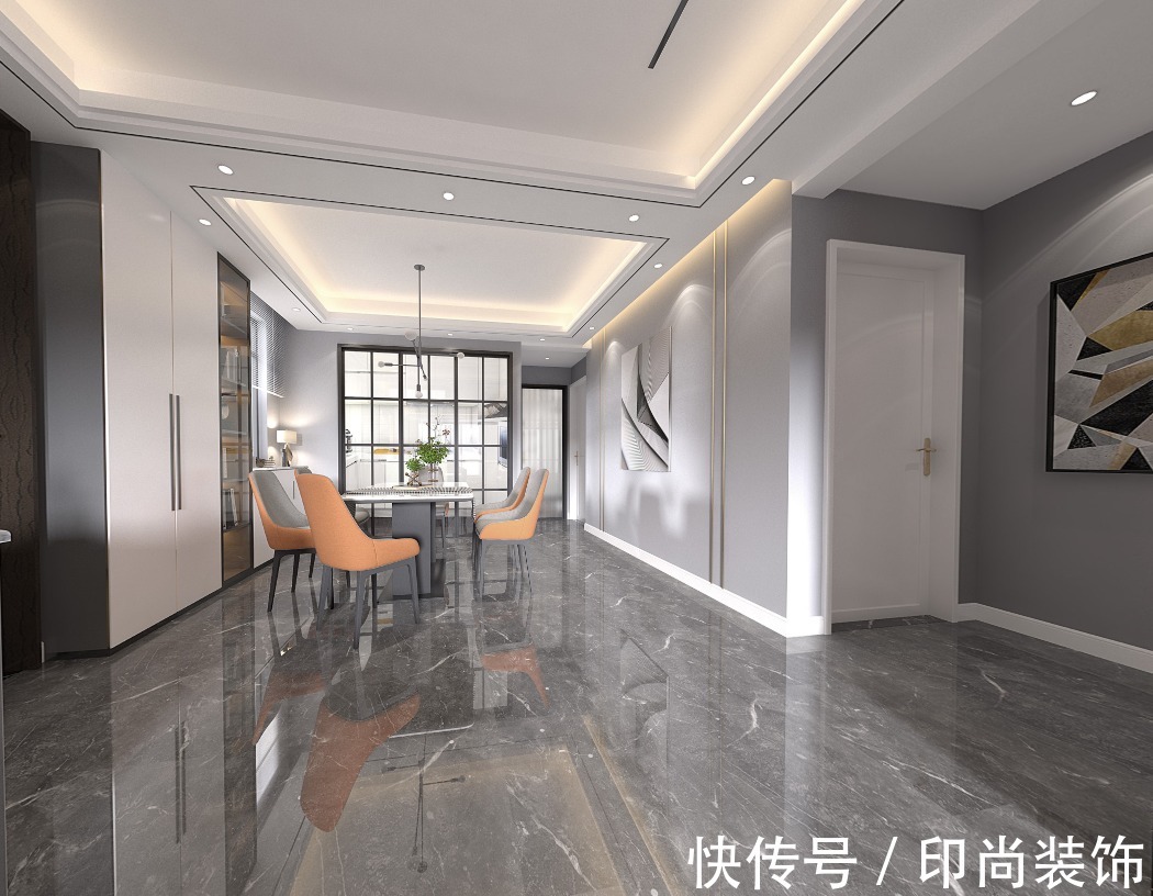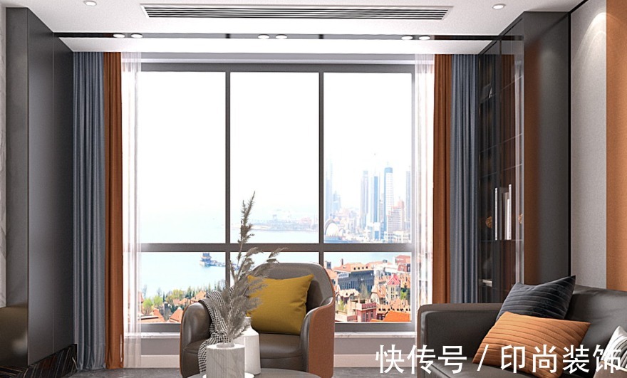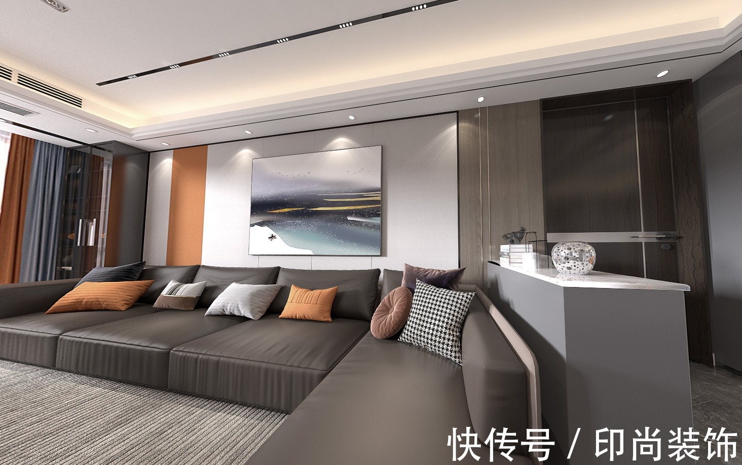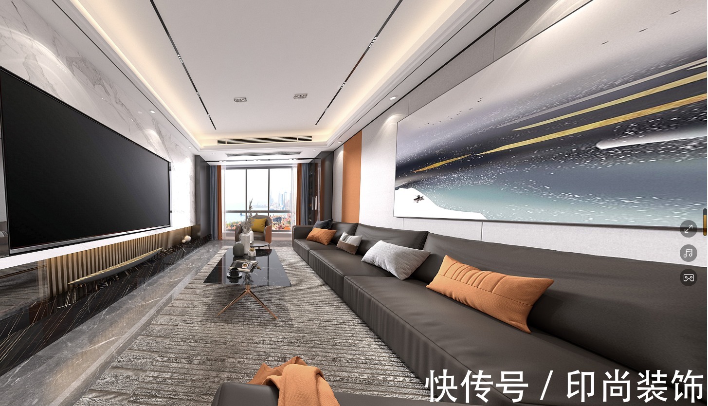 黑白灰为主色调,加以橙色的软装跳色打破空间的沉闷
