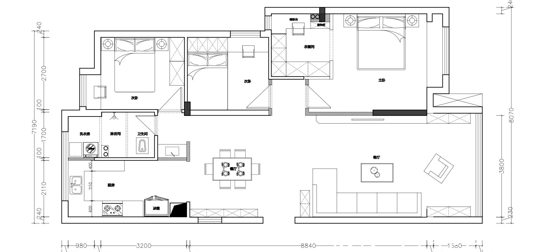 【摘 要】:小区:东风人家 面积:110㎡ 常住人口:4个 户型图: 通过立面与空间的结合,放大横厅的视觉效果 黑白灰为主色调,加以橙色的软装跳色打破空间的沉闷 背景墙的跳色与软装呼应,让